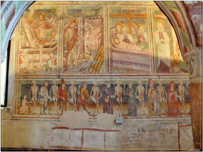 Pred koščeno spremljevalko so vsi enaki. Vsi stopajo z njo proti istemu cilju. Predvideva se, da je freska nastala pod vtisom srednjeveških epidemij kuge. Poleg freske lahko najdemo daljši zapis v glagolici, ki obeležuje postavitev novega rdeče obarvanega tlaka v letu 1518. Če si obiskovalec podrobneje ogleda fresko najde tudi daljši zapis v glagolici, ki poroča o postavitvi novega rdeče obarvanega tlaka v letu 1518.